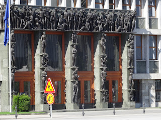 Pariament building covered in naked statues of everyday Slovenians including a lumberjack with a chain saw